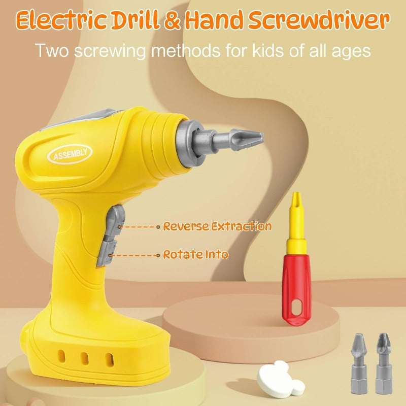 Two ways to build: battery drill with forward/reverse plus manual screwdriver for younger builders. Sized for small hands to boost coordination and confidence.